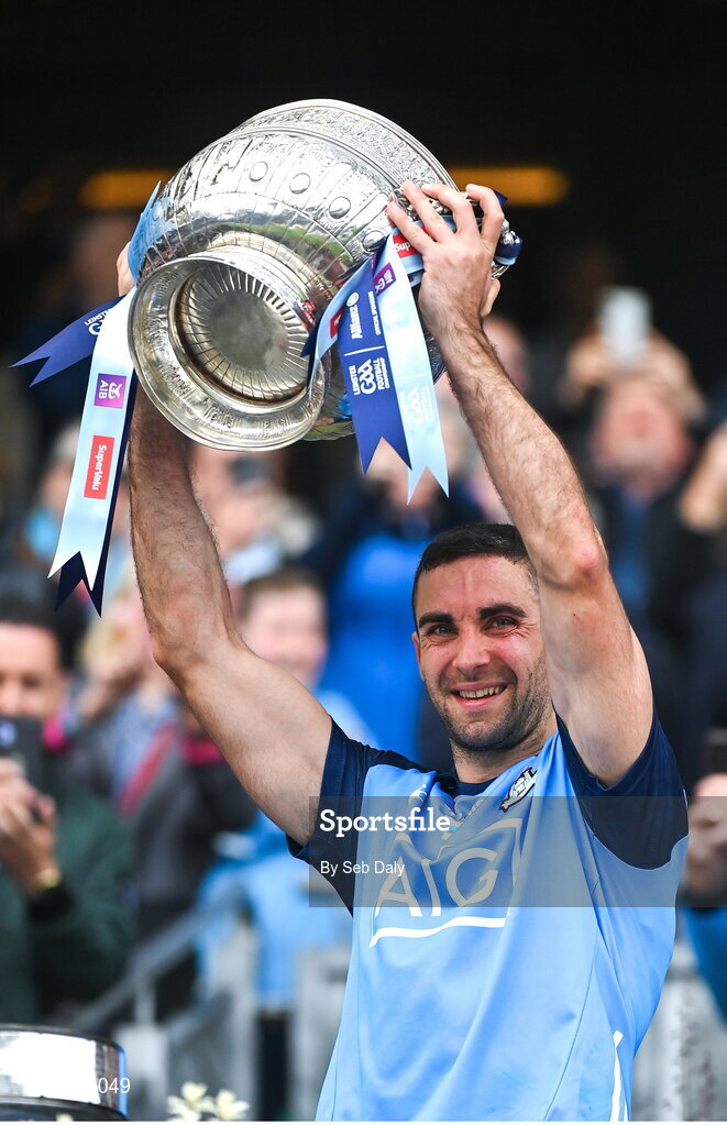 14 May 2023; Dublin captain James McCarthy lifts the Delaney Cup after his side's victory in the Leinster GAA Football Senior Championship Final match between Dublin and Louth at Croke Park in Dublin. Photo by Seb Daly/Sportsfile