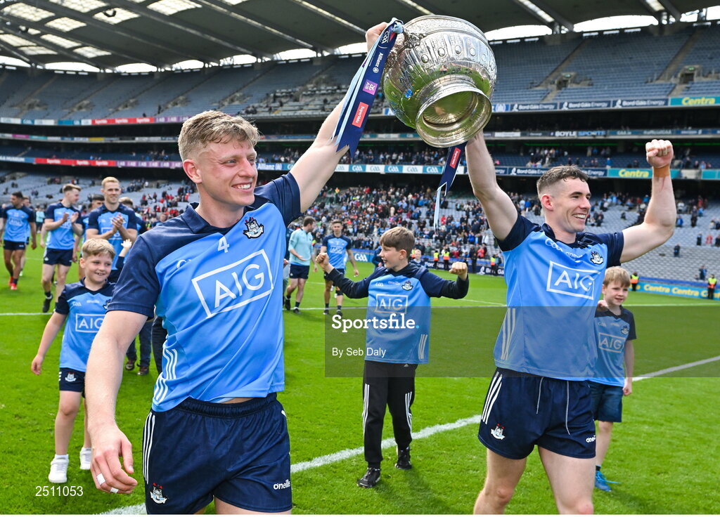 14 May 2023; Dublin players Cian Murphy, left, and Lee Gannon with the Delaney cup after their side's victory in the Leinster GAA Football Senior Championship Final match between Dublin and Louth at Croke Park in Dublin. Photo by Seb Daly/Sportsfile