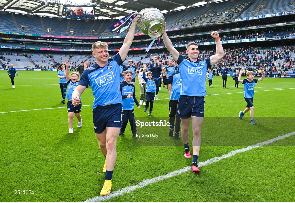 14 May 2023; Dublin players Cian Murphy, left, and Lee Gannon with the Delaney cup after their side's victory in the Leinster GAA Football Senior Championship Final match between Dublin and Louth at Croke Park in Dublin. Photo by Seb Daly/Sportsfile