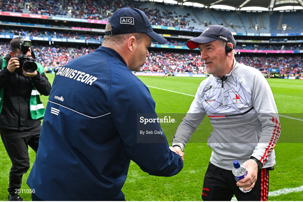14 May 2023; Dublin manager Dessie Farrell, left, and Louth manager Mickey Harte after the Leinster GAA Football Senior Championship Final match between Dublin and Louth at Croke Park in Dublin. Photo by Seb Daly/Sportsfile