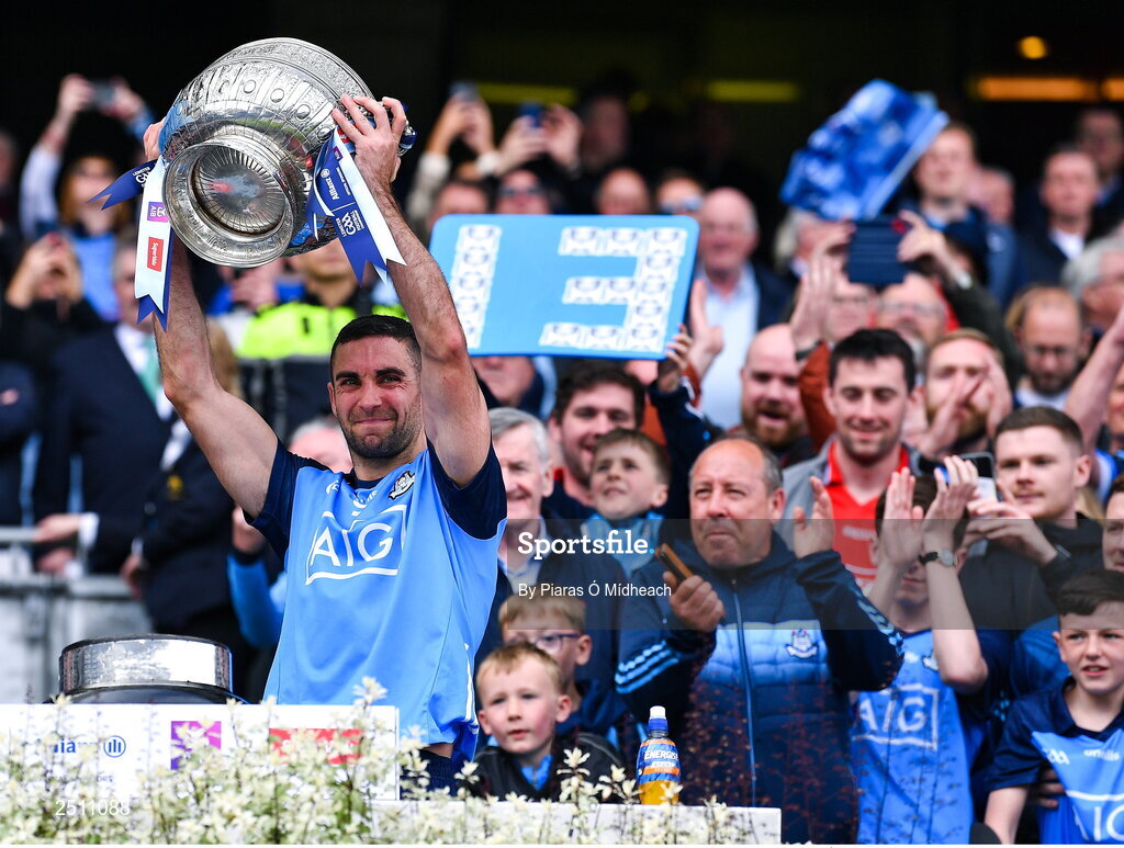 14 May 2023; Dublin captain James McCarthy lifts the Delaney Cup after his side's victory in the Leinster GAA Football Senior Championship Final match between Dublin and Louth at Croke Park in Dublin. Photo by Piaras Ó Mídheach/Sportsfile