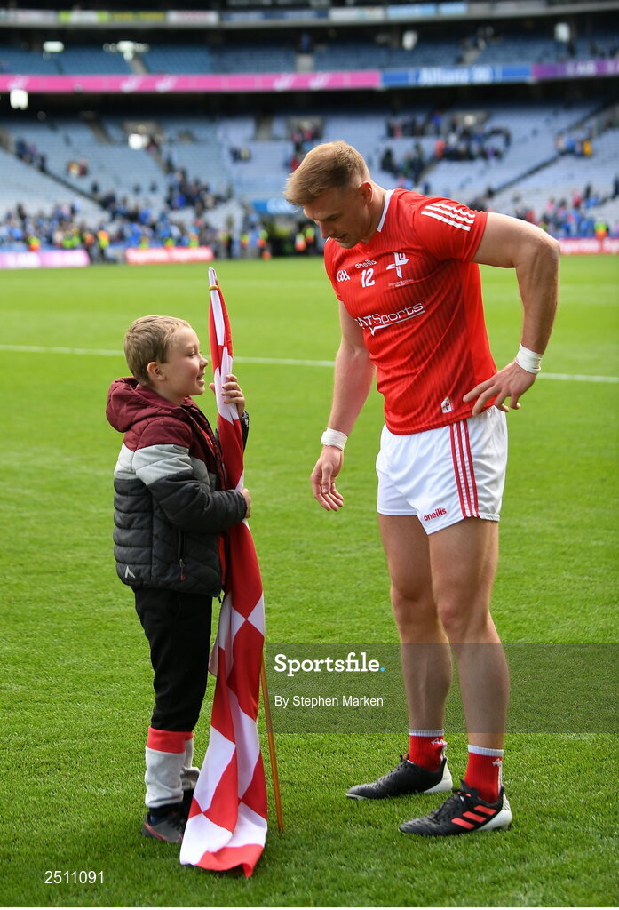 14 May 2023; Conor Grimes of Louth speaks to supporter, Joshua White, 8, after the Leinster GAA Football Senior Championship Final match between Dublin and Louth at Croke Park in Dublin. Photo by Stephen Marken/Sportsfile