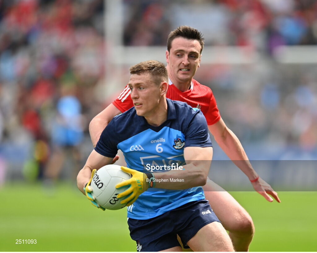 14 May 2023; John Small of Dublin in action against Tommy Durnin of Louth during the Leinster GAA Football Senior Championship Final match between Dublin and Louth at Croke Park in Dublin. Photo by Stephen Marken/Sportsfile