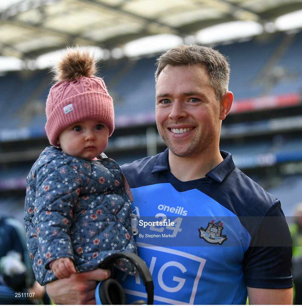 14 May 2023; Dean Rock of Dublin with his daughter Sadie, 10 months, after the Leinster GAA Football Senior Championship Final match between Dublin and Louth at Croke Park in Dublin. Photo by Stephen Marken/Sportsfile