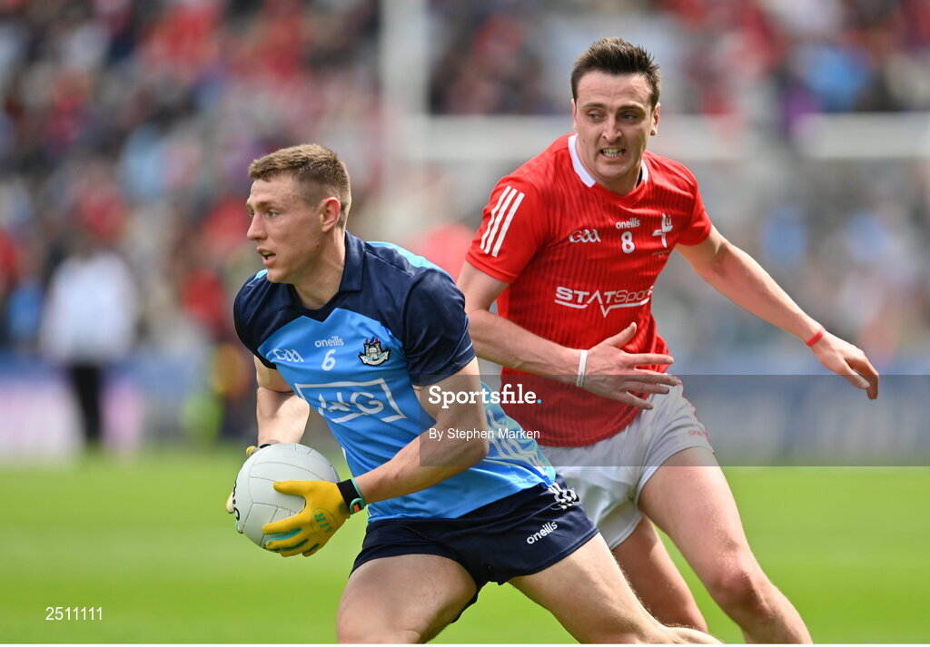 14 May 2023; John Small of Dublin in action against Tommy Durnin of Louth during the Leinster GAA Football Senior Championship Final match between Dublin and Louth at Croke Park in Dublin. Photo by Stephen Marken/Sportsfile