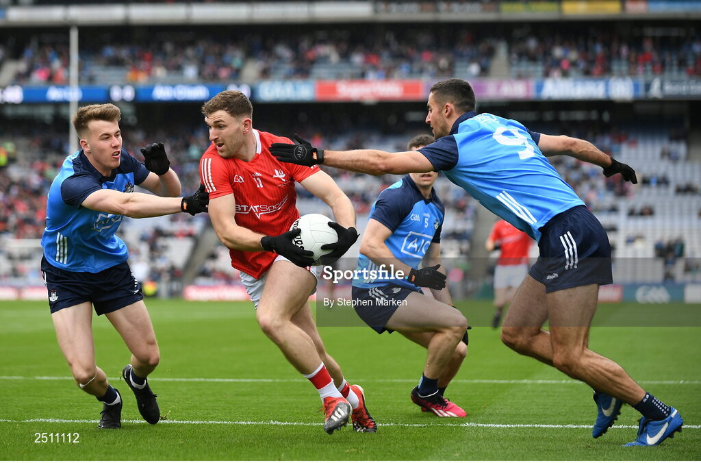 14 May 2023; Sam Mulroy of Louth in action against Daire Newcombe, left, and James McCarthy of Dublin during the Leinster GAA Football Senior Championship Final match between Dublin and Louth at Croke Park in Dublin. Photo by Stephen Marken/Sportsfile