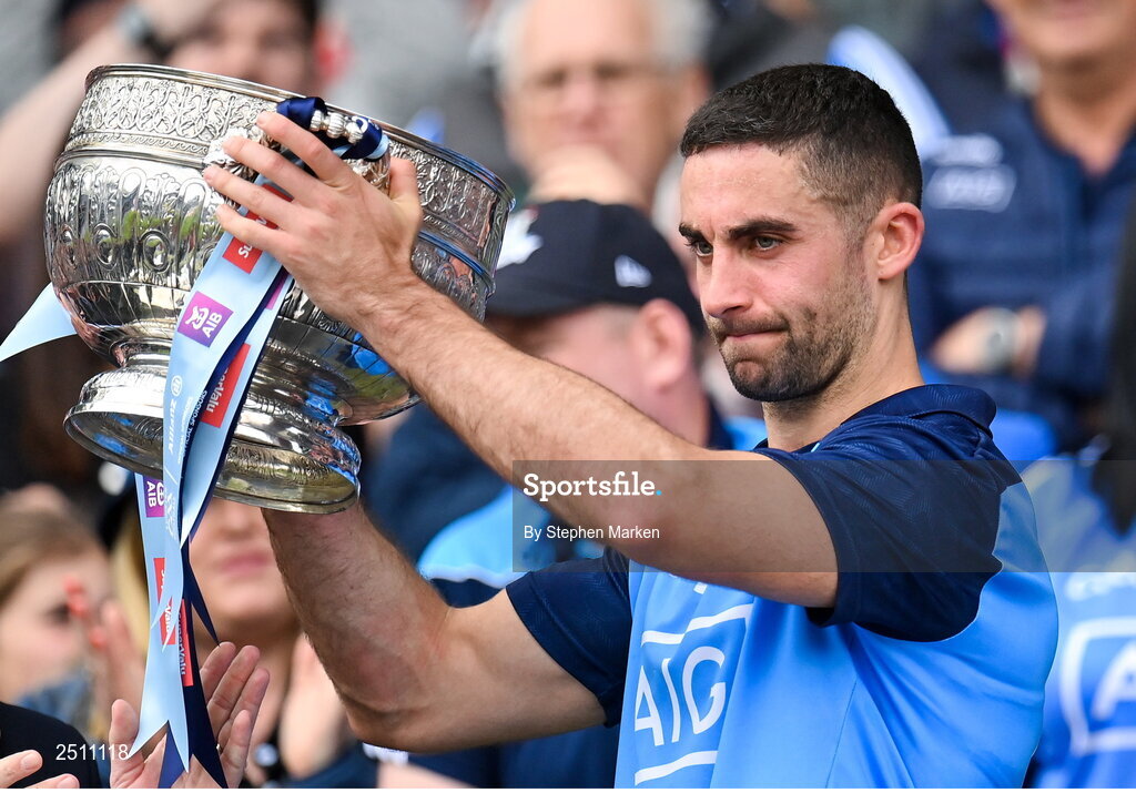 14 May 2023; Dublin captain James McCarthy lifts the Delaney Cup after his side's victory in the Leinster GAA Football Senior Championship Final match between Dublin and Louth at Croke Park in Dublin. Photo by Stephen Marken/Sportsfile