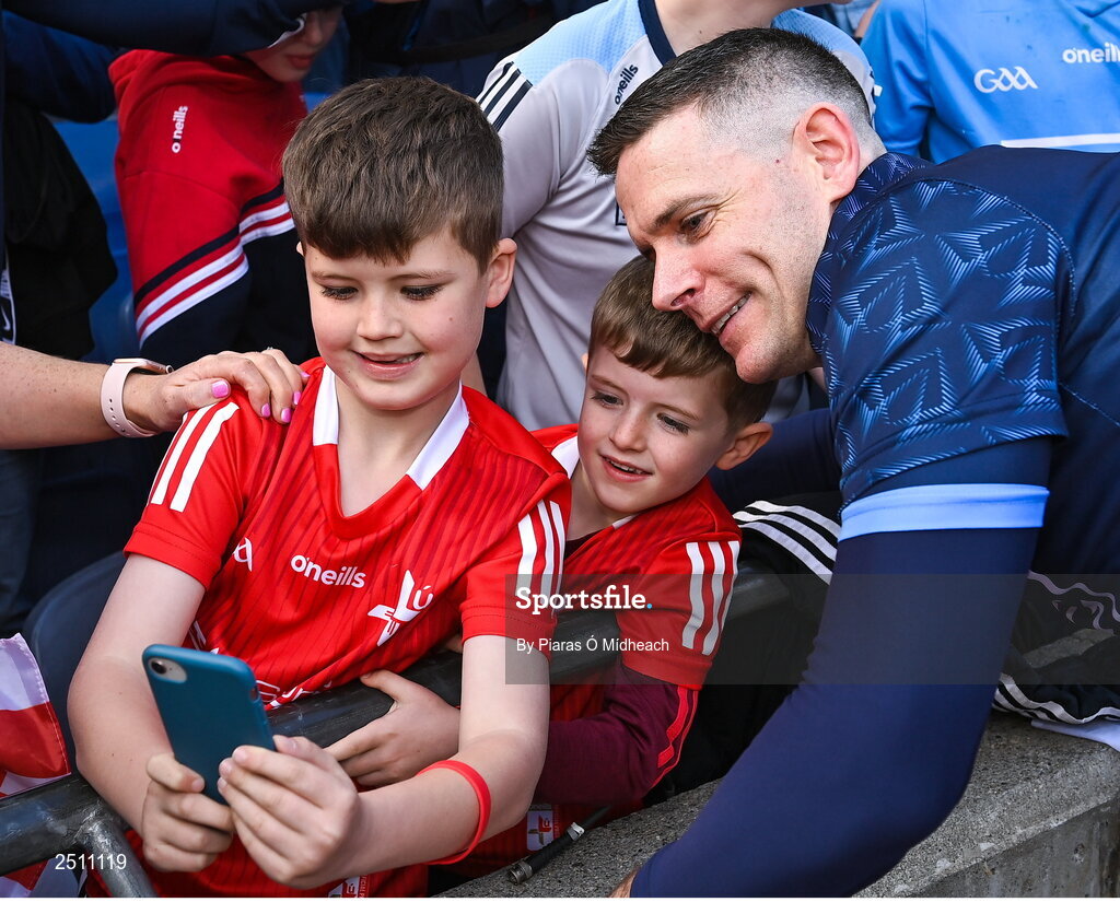 14 May 2023; Louth supporters Thias Sharkey, 9, and Harry Sharkey, 6, from Ardee take a selfie with Dublin goalkeeper Stephen Cluxton after the Leinster GAA Football Senior Championship Final match between Dublin and Louth at Croke Park in Dublin. Photo by Piaras Ó Mídheach/Sportsfile