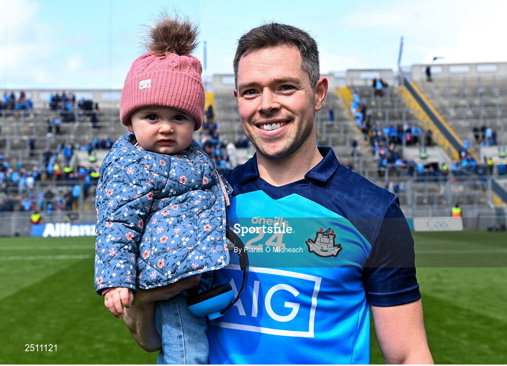14 May 2023; Dean Rock of Dublin with his 10 month old daughter Sadie after his side's victory in the Leinster GAA Football Senior Championship Final match between Dublin and Louth at Croke Park in Dublin. Photo by Piaras Ó Mídheach/Sportsfile