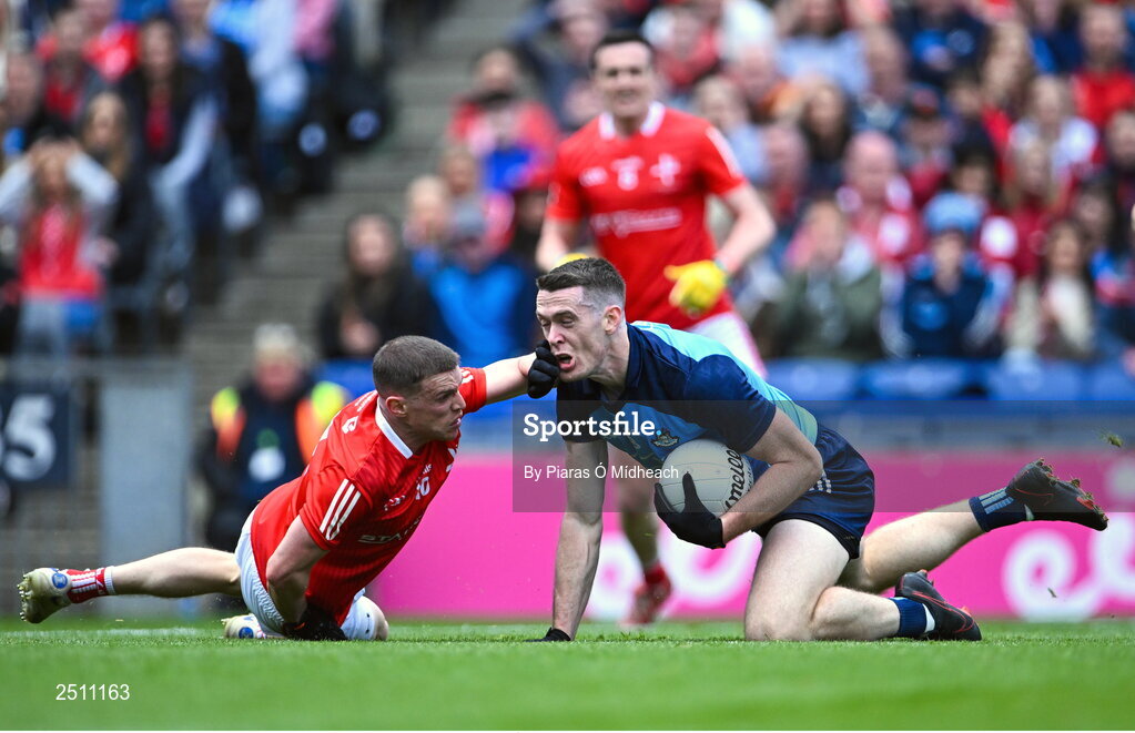 14 May 2023; Brian Fenton of Dublin in action against Conall McKeever of Louth during the Leinster GAA Football Senior Championship Final match between Dublin and Louth at Croke Park in Dublin. Photo by Piaras Ó Mídheach/Sportsfile