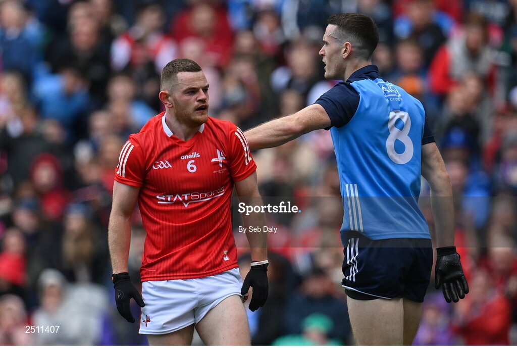 14 May 2023; Niall Sharkey of Louth is patted on the back by Dublin's Brian Fenton after tackling him during the Leinster GAA Football Senior Championship Final match between Dublin and Louth at Croke Park in Dublin. Photo by Seb Daly/Sportsfile