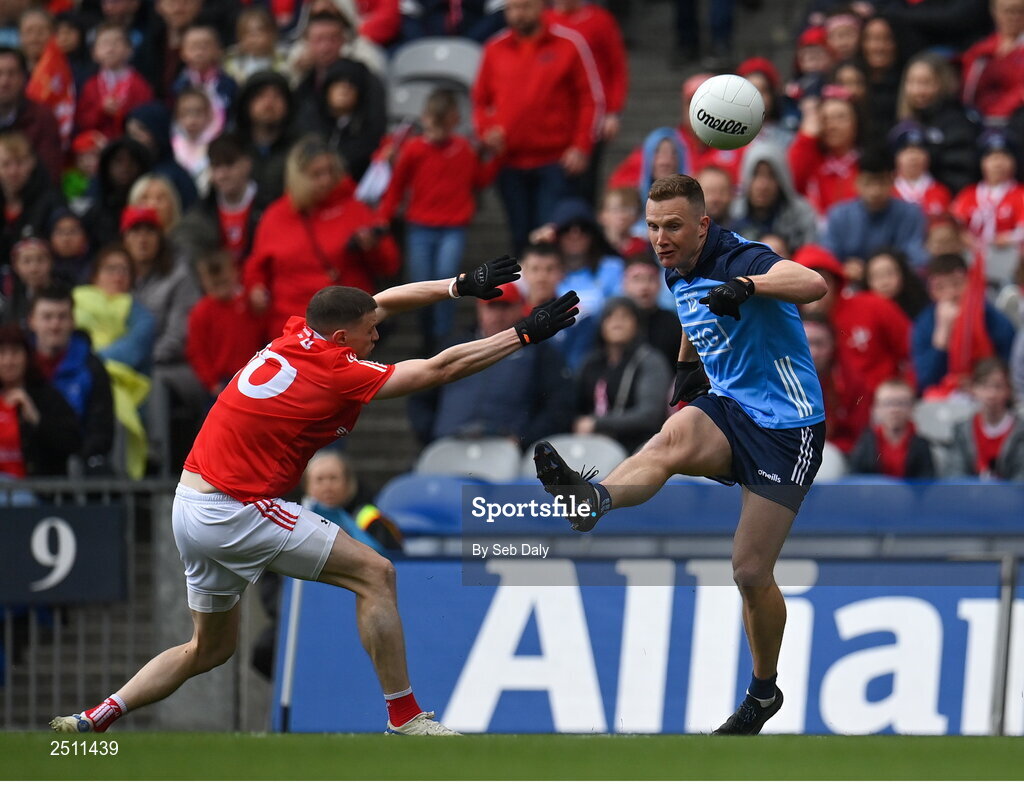 14 May 2023; Ciarán Kilkenny of Dublin in action against Conall McKeever of Louth during the Leinster GAA Football Senior Championship Final match between Dublin and Louth at Croke Park in Dublin. Photo by Seb Daly/Sportsfile
