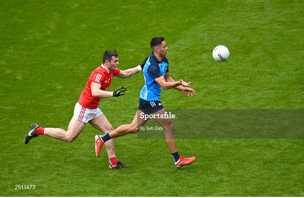 14 May 2023; Niall Scully of Dublin in action against Dan Corcoran of Louth during the Leinster GAA Football Senior Championship Final match between Dublin and Louth at Croke Park in Dublin. Photo by Seb Daly/Sportsfile