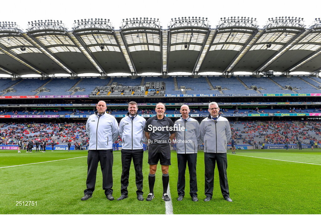 14 May 2023; Referee Conor Lane with his umpires before the Leinster GAA Football Senior Championship Final match between Dublin and Louth at Croke Park in Dublin. Photo by Piaras Ó Mídheach/Sportsfile