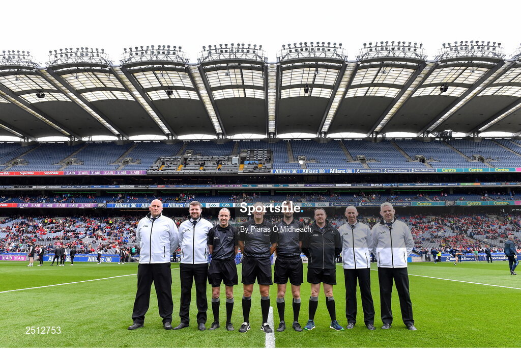 14 May 2023; Referee Conor Lane with his match officials before the Leinster GAA Football Senior Championship Final match between Dublin and Louth at Croke Park in Dublin. Photo by Piaras Ó Mídheach/Sportsfile