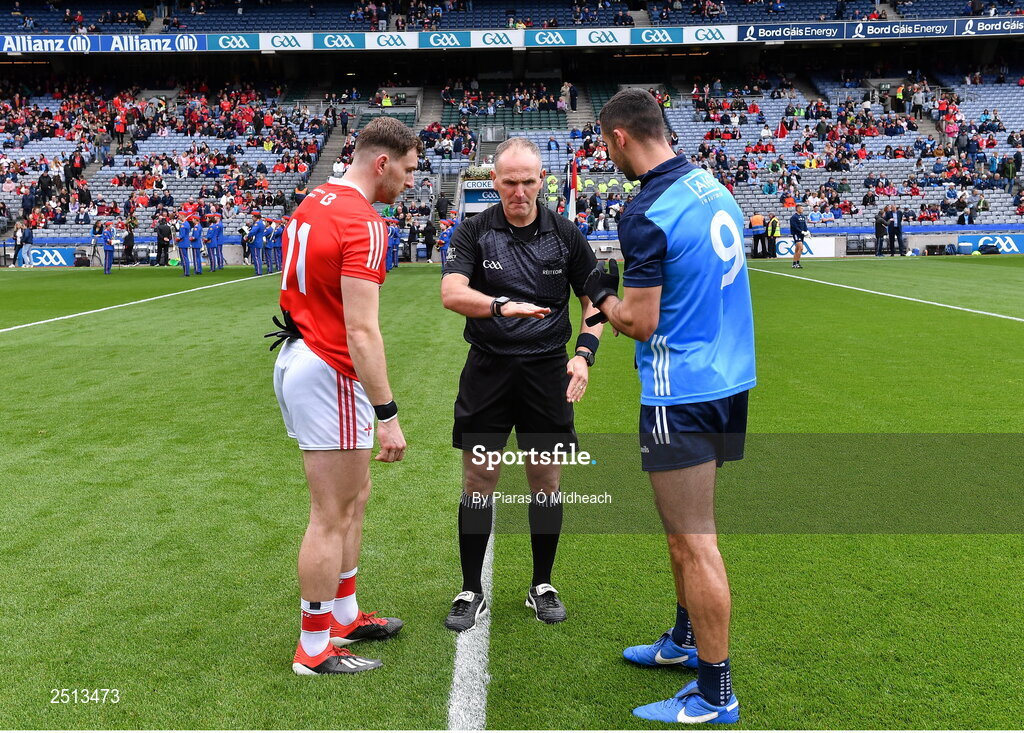 14 May 2023; Referee Conor Lane performs the coin toss with team captains Sam Mulroy of Louth and James McCarthy of Dublin before the Leinster GAA Football Senior Championship Final match between Dublin and Louth at Croke Park in Dublin. Photo by Piaras Ó Mídheach/Sportsfile