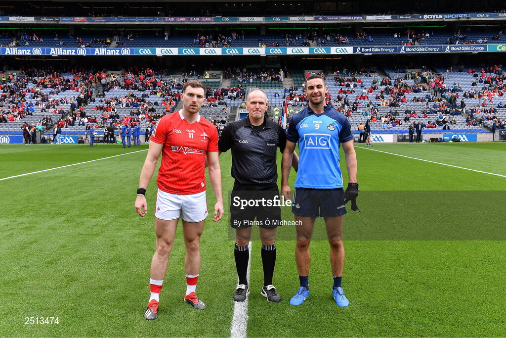 14 May 2023; Referee Conor Lane with team captains Sam Mulroy of Louth and James McCarthy of Dublin before the Leinster GAA Football Senior Championship Final match between Dublin and Louth at Croke Park in Dublin. Photo by Piaras Ó Mídheach/Sportsfile