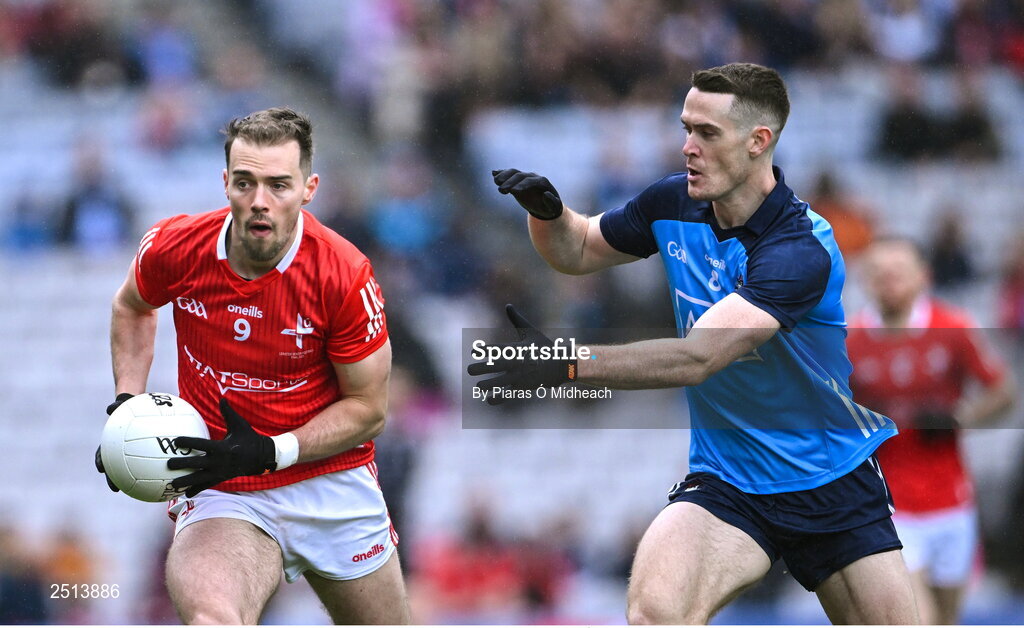 14 May 2023; Conor Early of Louth in action against Brian Fenton of Dublin during the Leinster GAA Football Senior Championship Final match between Dublin and Louth at Croke Park in Dublin. Photo by Piaras Ó Mídheach/Sportsfile