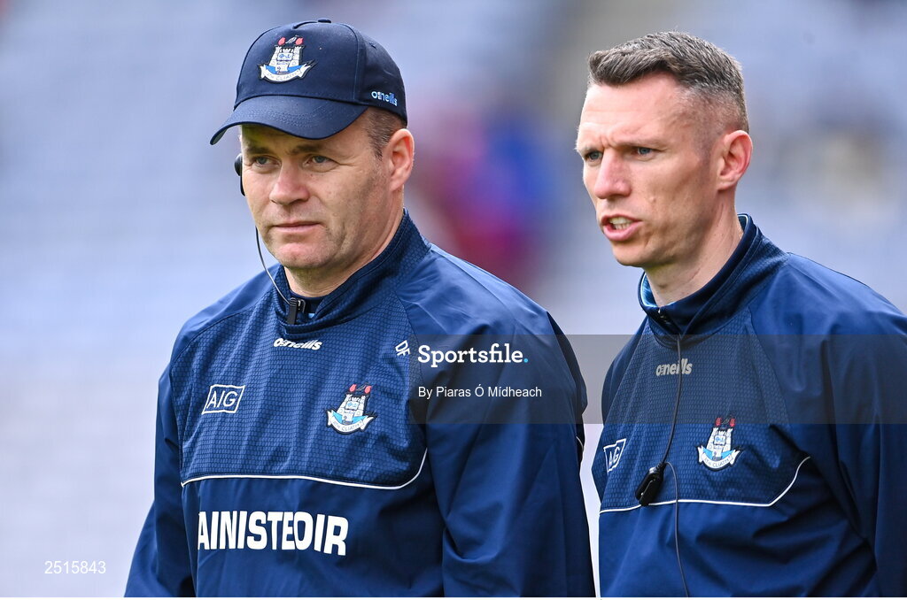 14 May 2023; Dublin manager Dessie Farrell, left, with Dublin selector Darren Daly during the Leinster GAA Football Senior Championship Final match between Dublin and Louth at Croke Park in Dublin. Photo by Piaras Ó Mídheach/Sportsfile