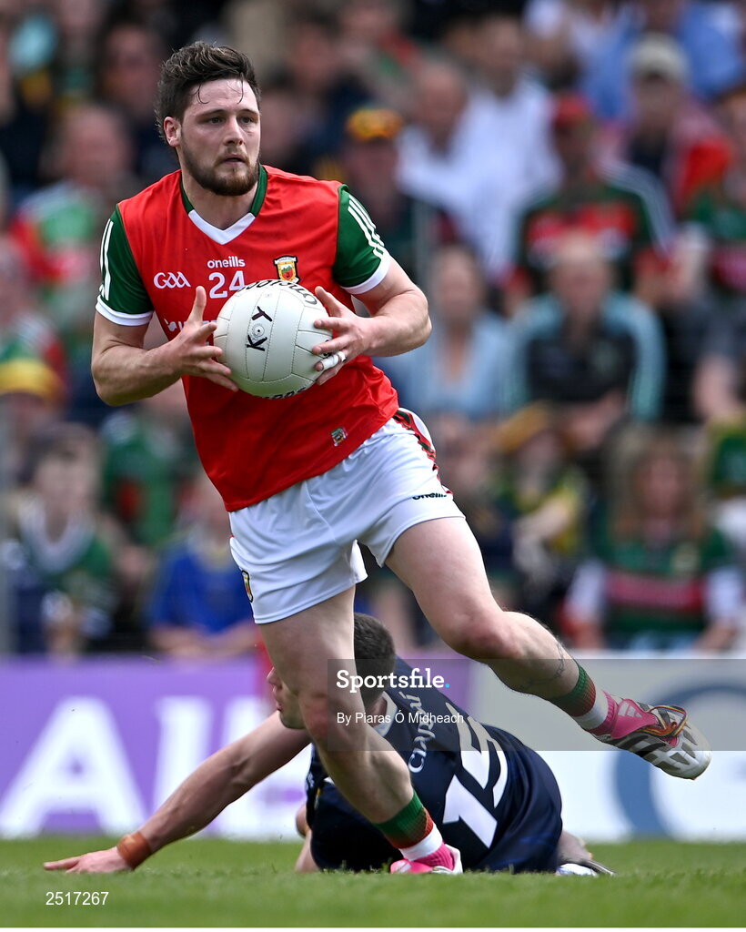 20 May 2023; Pádraig O’Hora of Mayo in action against Paul Geaney of Kerry during the GAA Football All-Ireland Senior Championship Round 1 match between Kerry and Mayo at Fitzgerald Stadium in Killarney, Kerry. Photo by Piaras Ó Mídheach/Sportsfile