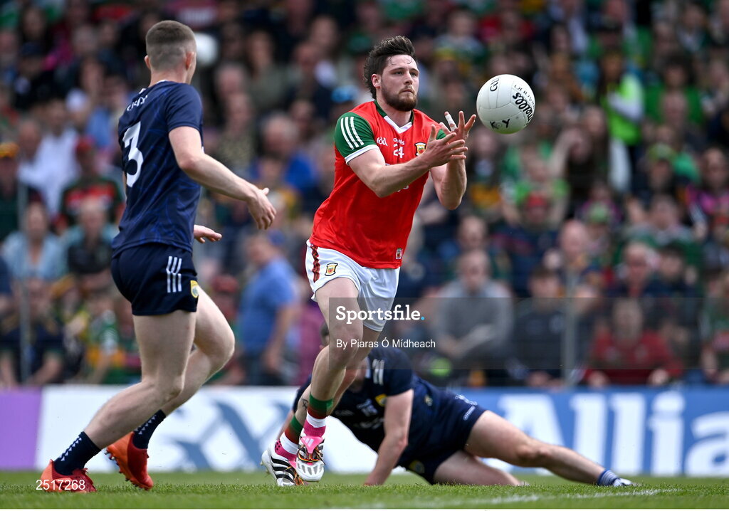 20 May 2023; Pádraig O’Hora of Mayo handpasses the ball over the bar to score a point during the GAA Football All-Ireland Senior Championship Round 1 match between Kerry and Mayo at Fitzgerald Stadium in Killarney, Kerry. Photo by Piaras Ó Mídheach/Sportsfile