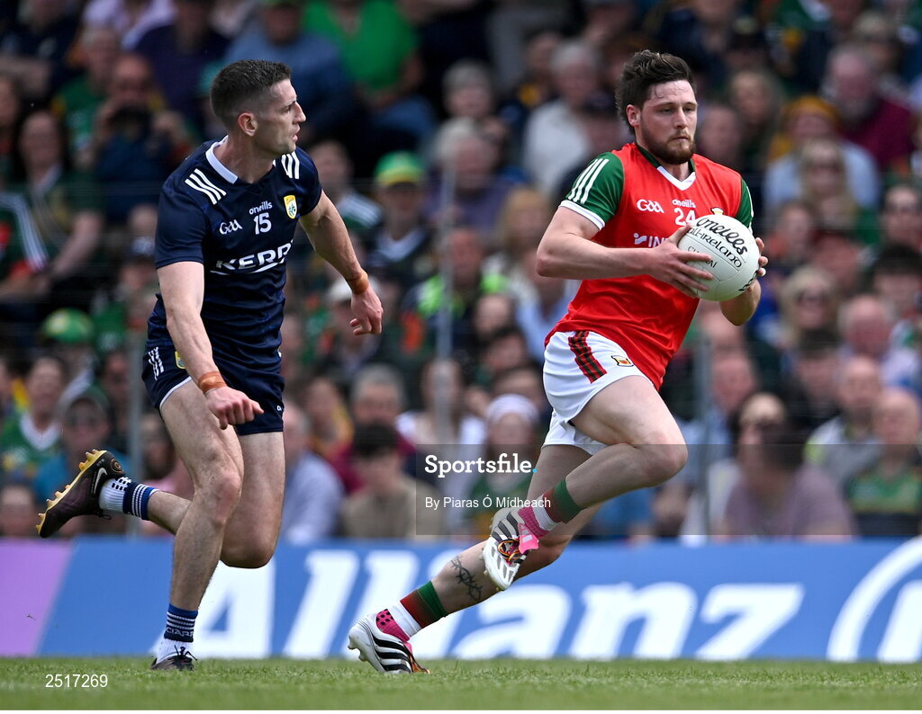20 May 2023; Pádraig O’Hora of Mayo in action against Paul Geaney of Kerry during the GAA Football All-Ireland Senior Championship Round 1 match between Kerry and Mayo at Fitzgerald Stadium in Killarney, Kerry. Photo by Piaras Ó Mídheach/Sportsfile