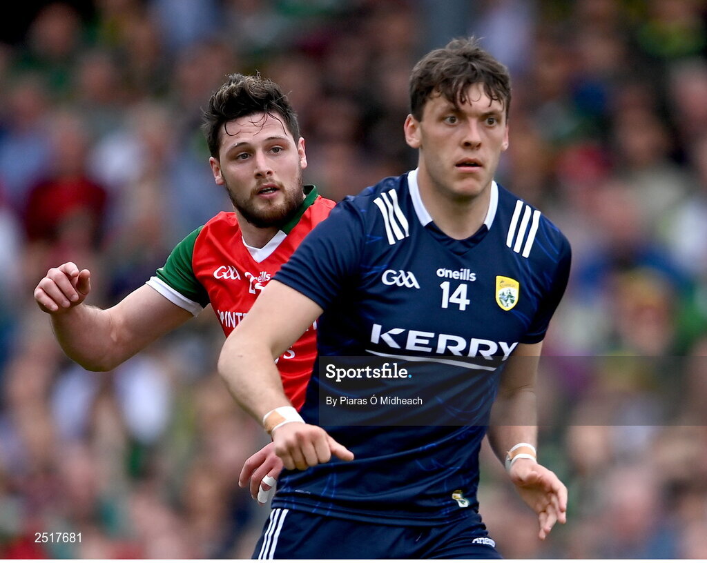 20 May 2023; Pádraig O’Hora of Mayo and David Clifford of Kerry during the GAA Football All-Ireland Senior Championship Round 1 match between Kerry and Mayo at Fitzgerald Stadium in Killarney, Kerry. Photo by Piaras Ó Mídheach/Sportsfile
