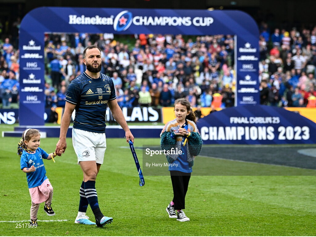 20 May 2023; Jamison Gibson-Park of Leinster with his daughters Iris and Isabella after his side's defeat in the Heineken Champions Cup Final match between Leinster and La Rochelle at Aviva Stadium in Dublin. Photo by Harry Murphy/Sportsfile