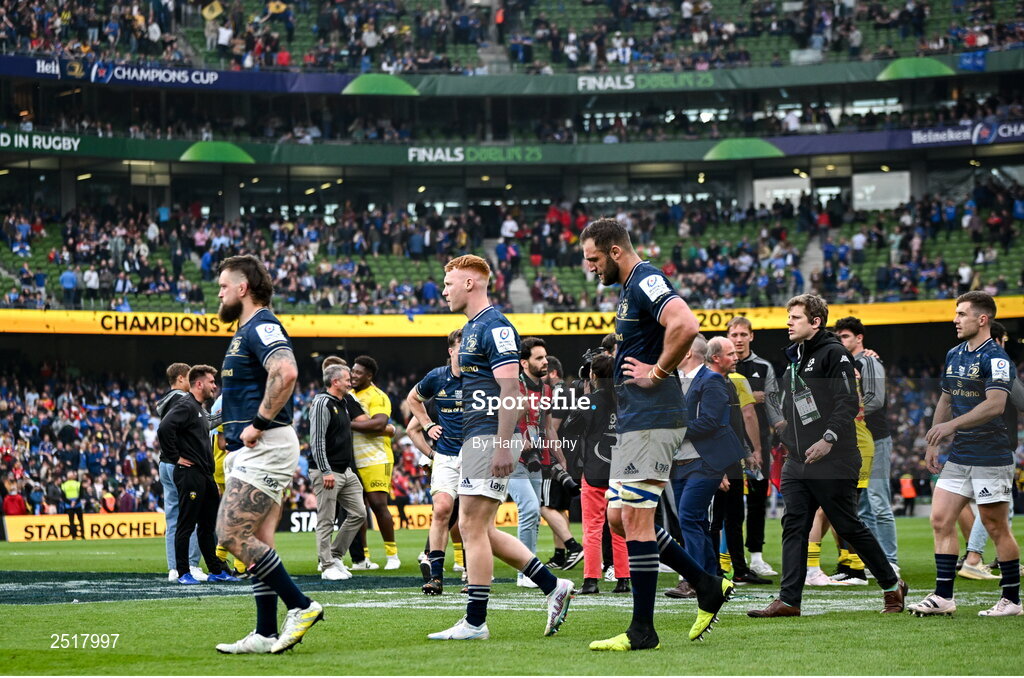20 May 2023; Leinster players, from left, Andrew Porter, Ciarán Frawley and Jason Jenkins after their side's defeat in the Heineken Champions Cup Final match between Leinster and La Rochelle at Aviva Stadium in Dublin. Photo by Harry Murphy/Sportsfile