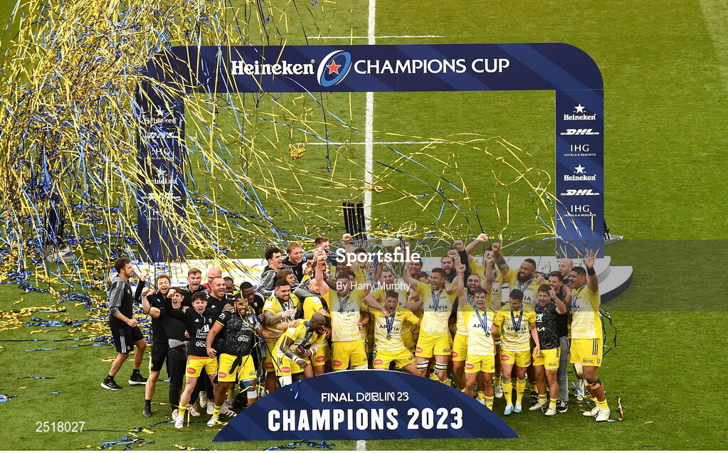 20 May 2023; Gregory Alldritt, left, and Romain Sazy of La Rochelle lift the trophy after the Heineken Champions Cup final match between Leinster and La Rochelle at the Aviva Stadium in Dublin. Photo by Harry Murphy/Sportsfile