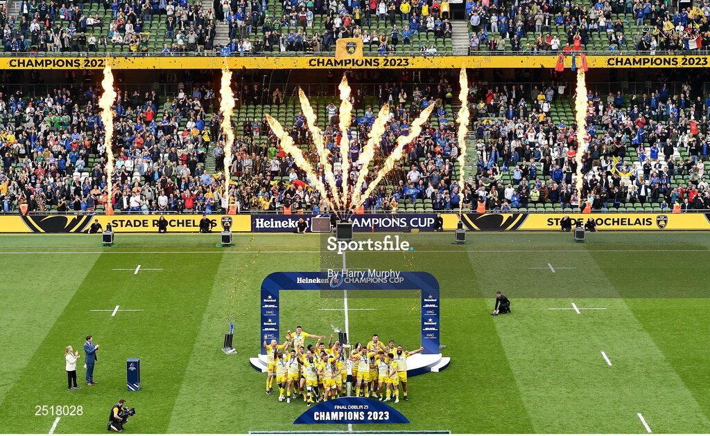 20 May 2023; Gregory Alldritt, left, and Romain Sazy of La Rochelle lift the trophy after the Heineken Champions Cup final match between Leinster and La Rochelle at the Aviva Stadium in Dublin. Photo by Harry Murphy/Sportsfile
