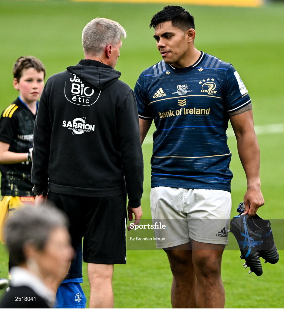 20 May 2023; Michael Ala'alatoa of Leinster, right, with La Rochelle head coach Ronan O'Gara after the Heineken Champions Cup Final match between Leinster and La Rochelle at Aviva Stadium in Dublin. Photo by Brendan Moran/Sportsfile