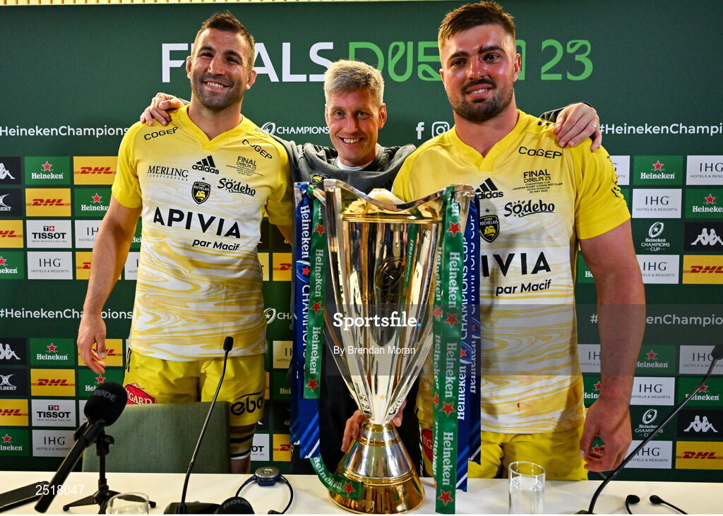 20 May 2023; La Rochelle head coach Ronan O'Gara, centre, with Romain Sazy, left, and Grégory Alldritt after the Heineken Champions Cup Final match between Leinster and La Rochelle at Aviva Stadium in Dublin. Photo by Brendan Moran/Sportsfile