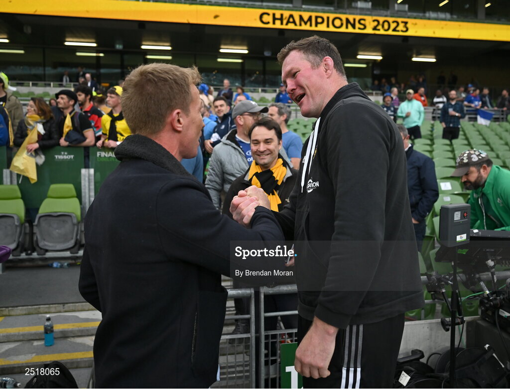 20 May 2023; La Rochelle assistant coach Donnacha Ryan, right, with his former Munster teammate Jerry Flannery after the Heineken Champions Cup Final match between Leinster and La Rochelle at Aviva Stadium in Dublin. Photo by Brendan Moran/Sportsfile