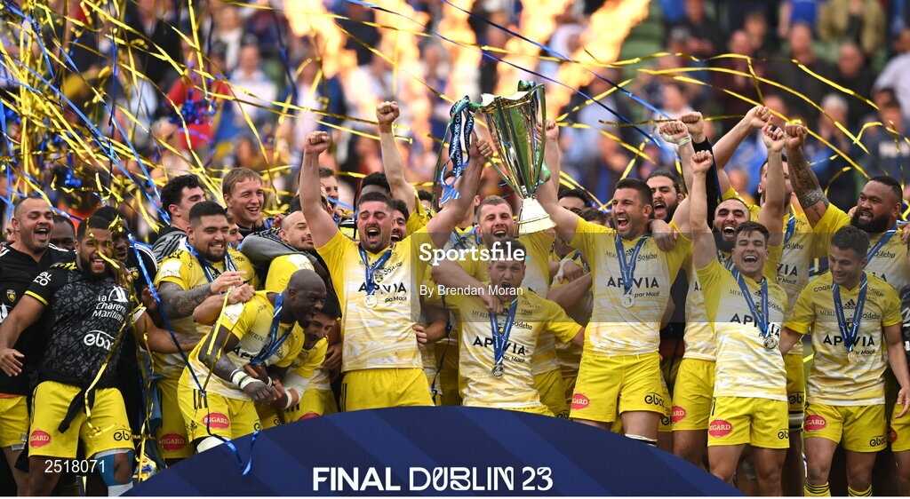 20 May 2023; The La Rochelle team ceelbrate after lifting the Champions Cup following the Heineken Champions Cup Final match between Leinster and La Rochelle at Aviva Stadium in Dublin. Photo by Brendan Moran/Sportsfile