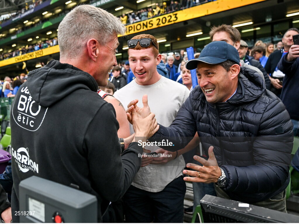20 May 2023; La Rochelle head coach Ronan O'Gara, left, celebrates with former Munster teammate Federico Pucciariello after the Heineken Champions Cup Final match between Leinster and La Rochelle at Aviva Stadium in Dublin. Photo by Brendan Moran/Sportsfile