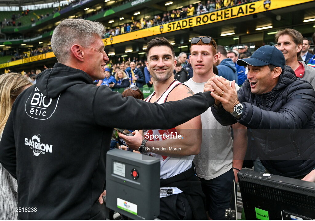 20 May 2023; La Rochelle head coach Ronan O'Gara, left, celebrates with former Munster teammate Federico Pucciariello after the Heineken Champions Cup Final match between Leinster and La Rochelle at Aviva Stadium in Dublin. Photo by Brendan Moran/Sportsfile