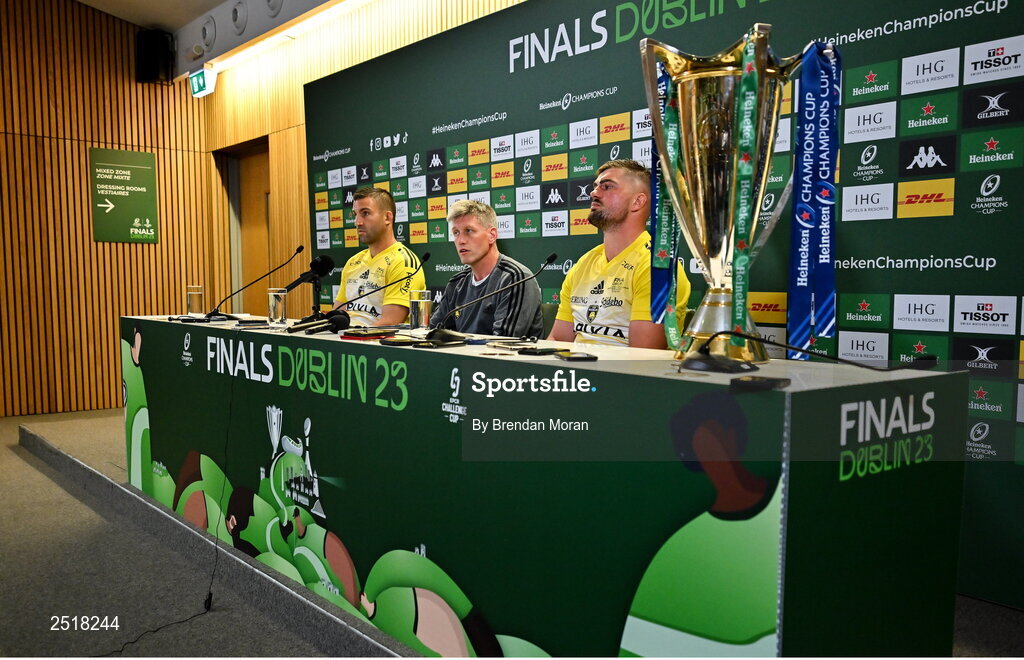 20 May 2023; La Rochelle head coach Ronan O'Gara, centre, with Romain Sazy, left, and Grégory Alldritt during the post match media conference after the Heineken Champions Cup Final match between Leinster and La Rochelle at Aviva Stadium in Dublin. Photo by Brendan Moran/Sportsfile