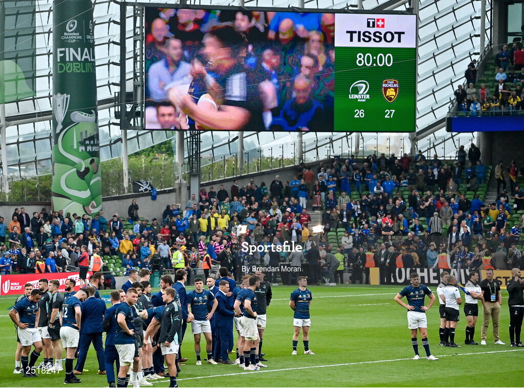 20 May 2023; Dejected Leinster players after the Heineken Champions Cup Final match between Leinster and La Rochelle at Aviva Stadium in Dublin. Photo by Brendan Moran/Sportsfile