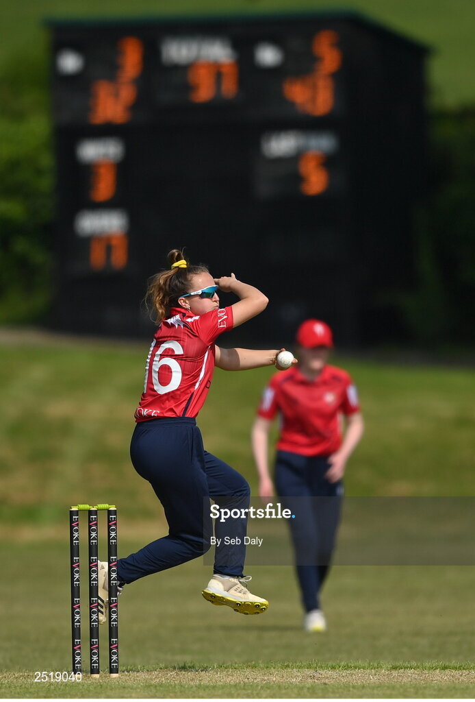 21 May 2023; Dragons bowler Leah Paul during the Evoke Super Series match between Dragons and Typhoons at Oak Hill Cricket Club in Kilbride, Wicklow. Photo by Seb Daly/Sportsfile