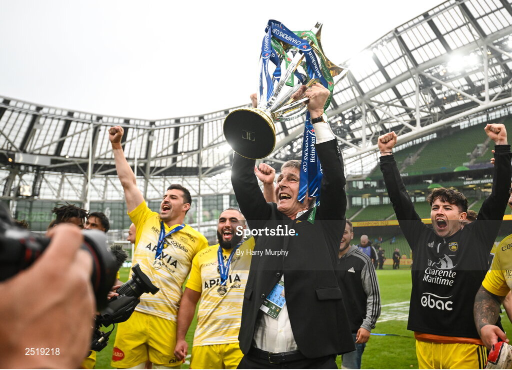20 May 2023; La Rochelle president Vincent Merling lifts the trophy after the Heineken Champions Cup final match between Leinster and La Rochelle at the Aviva Stadium in Dublin. Photo by Harry Murphy/Sportsfile