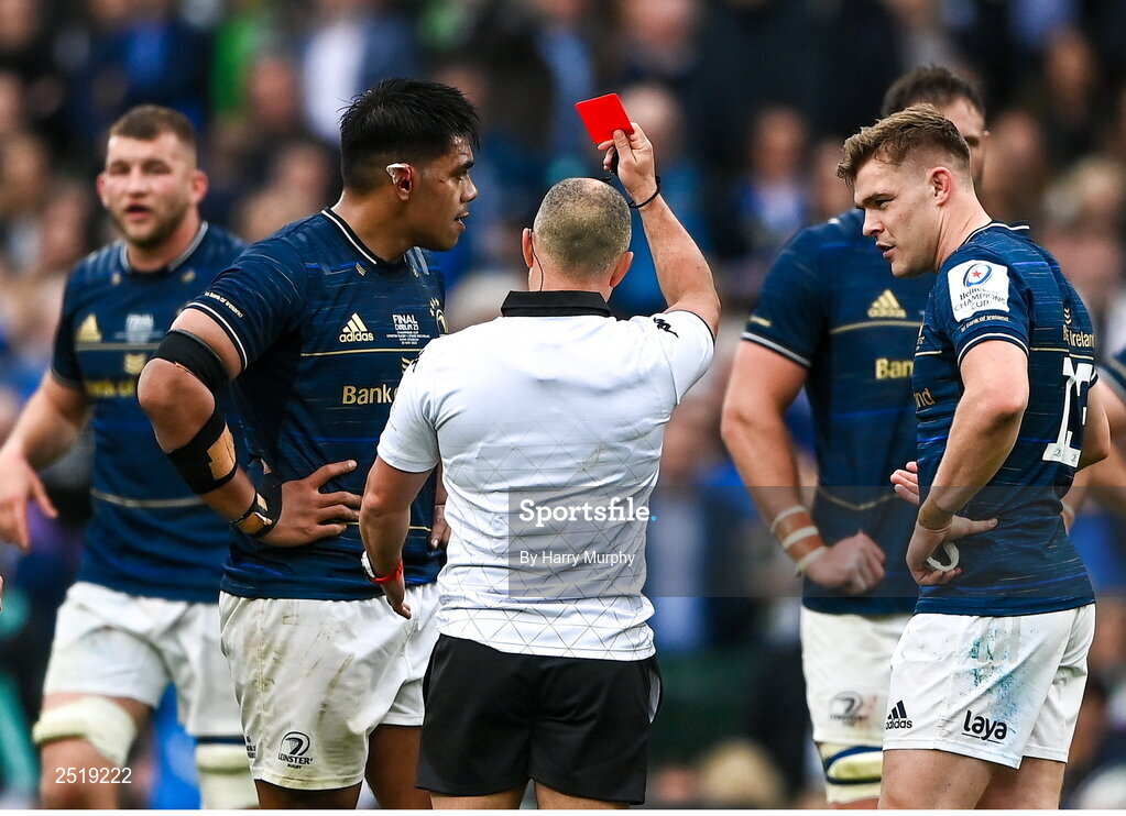20 May 2023; Michael Ala'alatoa of Leinster is shown a red card by referee Jaco Peyper during the Heineken Champions Cup final match between Leinster and La Rochelle at the Aviva Stadium in Dublin. Photo by Harry Murphy/Sportsfile