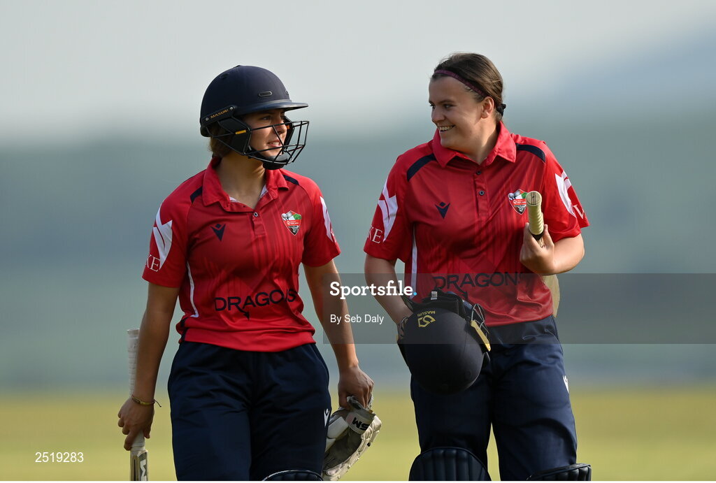 21 May 2023; Dragons batters Amy Hunter, left, and Molly Devine after their side's victory in the Evoke Super Series match between Dragons and Typhoons at Oak Hill Cricket Club in Kilbride, Wicklow. Photo by Seb Daly/Sportsfile