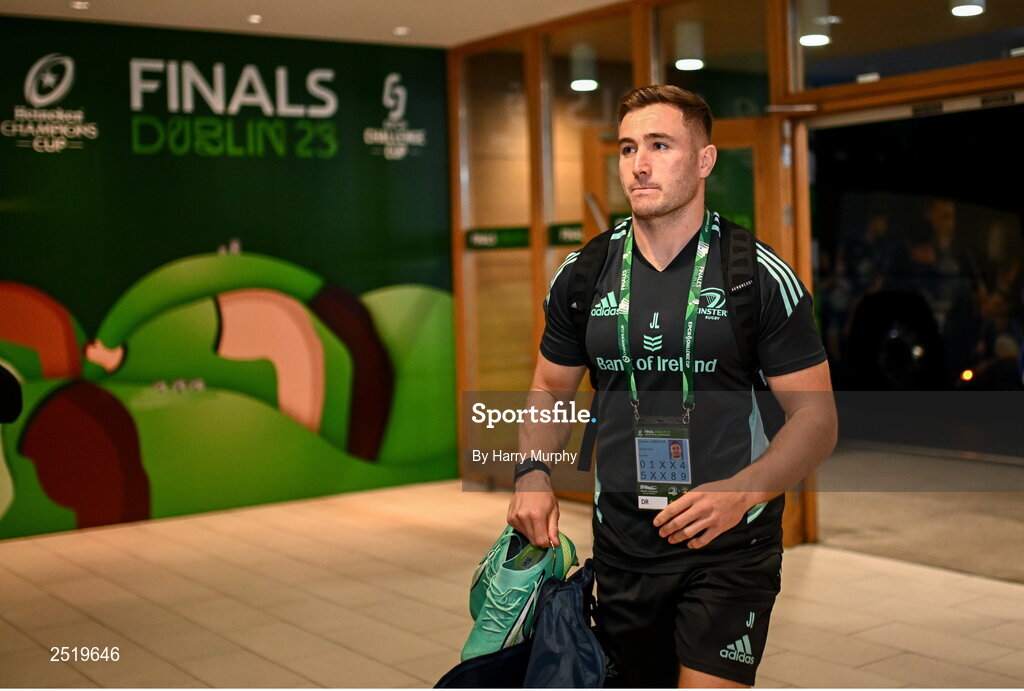 20 May 2023; Jordan Larmour of Leinster arrives before the Heineken Champions Cup final match between Leinster and La Rochelle at the Aviva Stadium in Dublin. Photo by Harry Murphy/Sportsfile