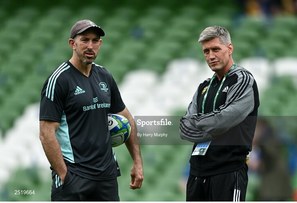 20 May 2023; Leinster assistant coach Andrew Goodman and La Rochelle head coach Ronan O'Gara before the Heineken Champions Cup final match between Leinster and La Rochelle at the Aviva Stadium in Dublin. Photo by Harry Murphy/Sportsfile