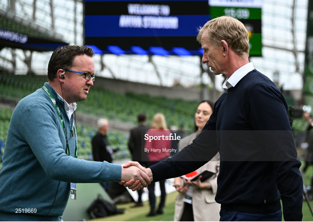 20 May 2023; Leinster head coach Leo Cullen shakes hands with Damien O’Meara of RTE before the Heineken Champions Cup final match between Leinster and La Rochelle at the Aviva Stadium in Dublin. Photo by Harry Murphy/Sportsfile