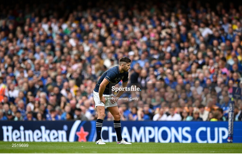 20 May 2023; Ross Byrne of Leinster during the Heineken Champions Cup Final match between Leinster and La Rochelle at Aviva Stadium in Dublin. Photo by Ramsey Cardy/Sportsfile