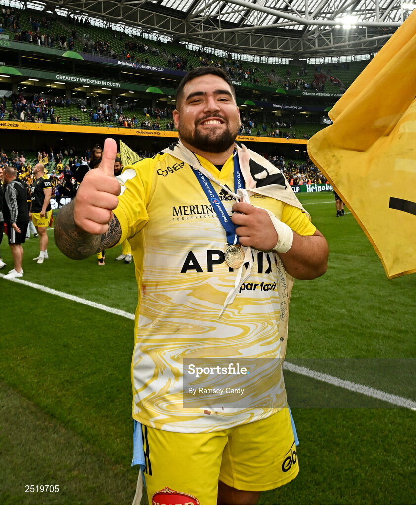 20 May 2023; Joel Sclavi of La Rochelle celebrates after the Heineken Champions Cup Final match between Leinster and La Rochelle at Aviva Stadium in Dublin. Photo by Ramsey Cardy/Sportsfile