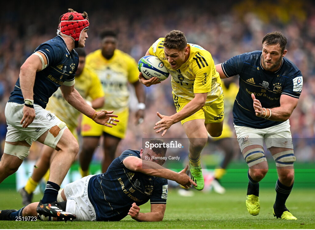20 May 2023; Tawera Kerr Barlow of La Rochelle is tackled by Ross Molony of Leinster during the Heineken Champions Cup Final match between Leinster and La Rochelle at Aviva Stadium in Dublin. Photo by Ramsey Cardy/Sportsfile