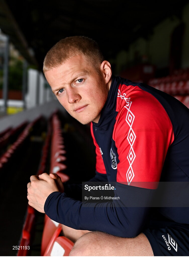 24 May 2023; Tom Grivosti poses for a portrait after a St Patrick's Athletic media conference at Richmond Park in Dublin. Photo by Piaras Ó Mídheach/Sportsfile
